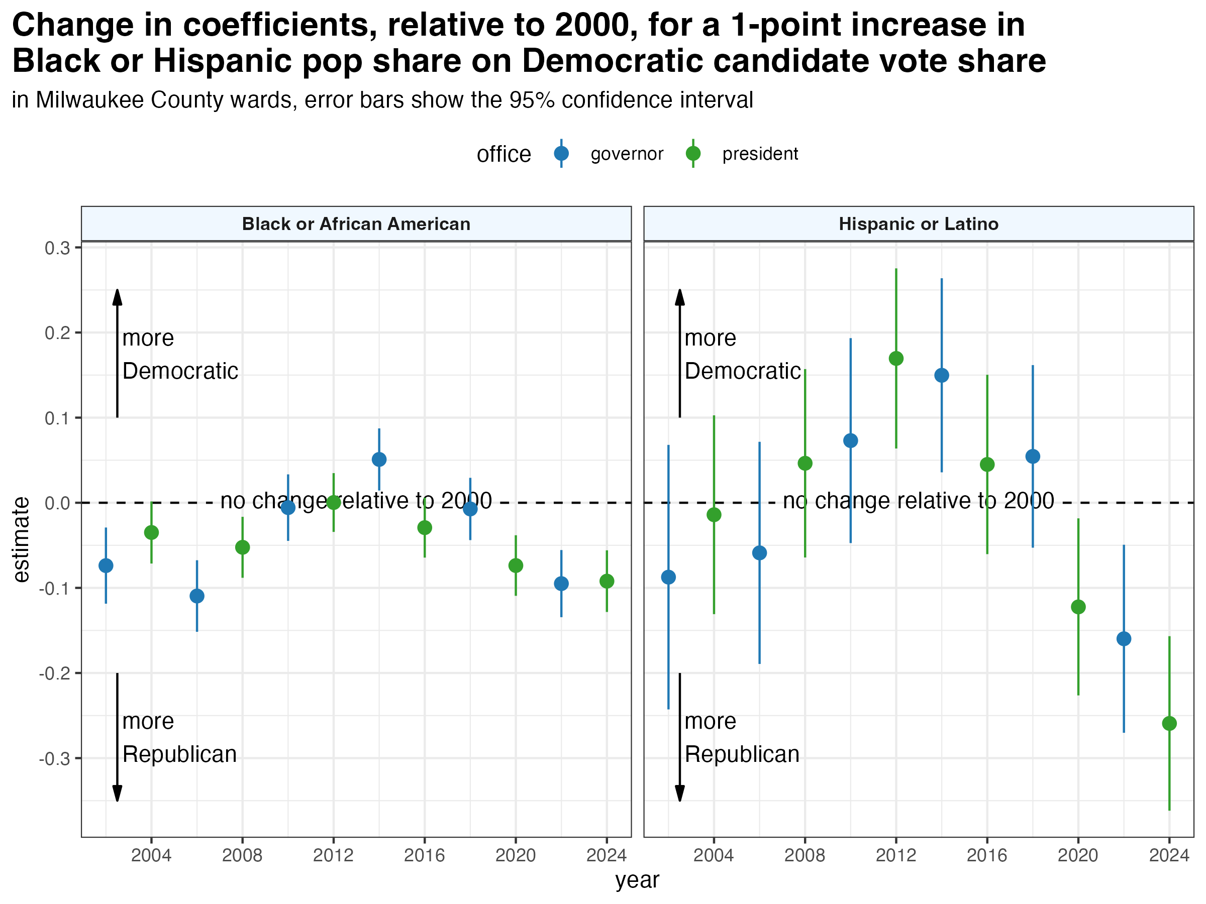 For a more rigorous approach, I ran a regression model predicting Democratic vote share in each ward with independent variables for each racial group’s share of the adult population along with interaction terms for each individual election. In the model, 2000 is the base year.