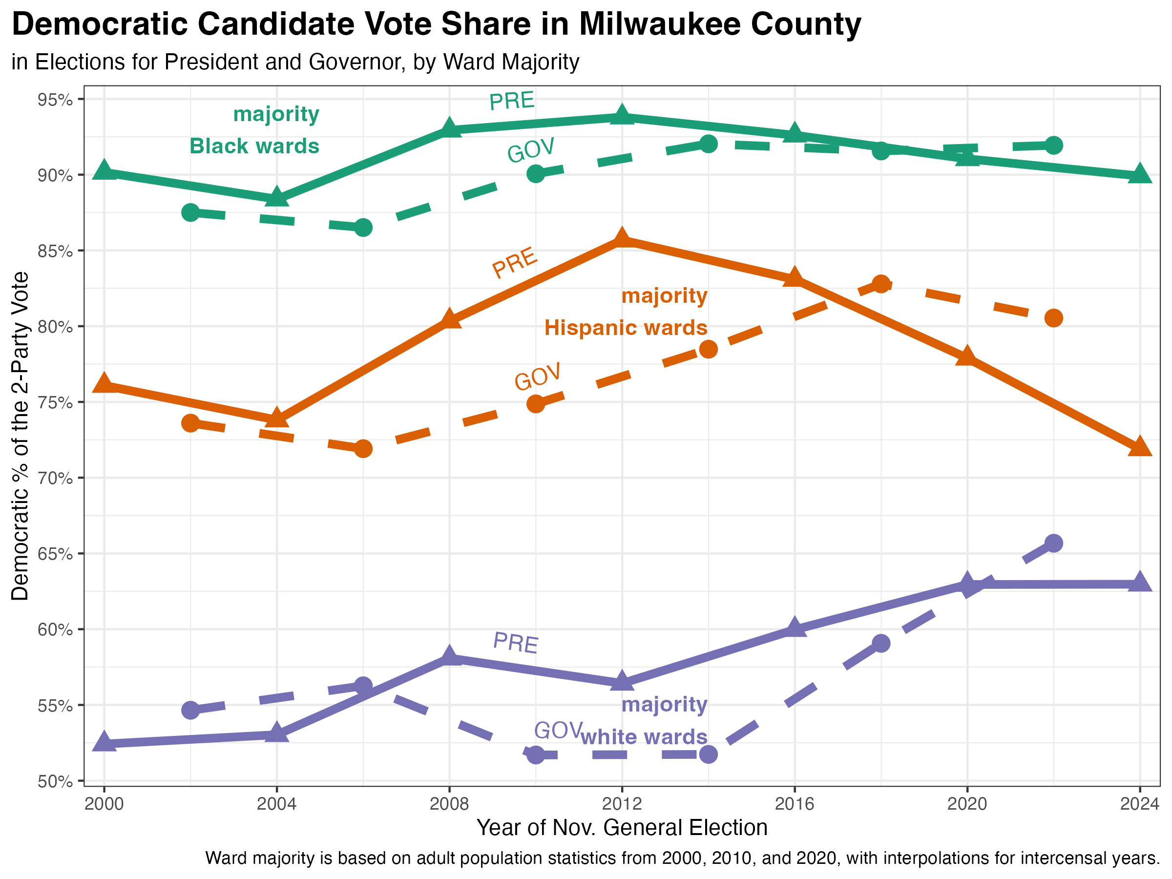 A simple approach is just to measure how the county’s majority Black, white, and Hispanic wards voted. I calculated each ward’s majority using census block redistricting data (and cubic spline interpolation for intercensal years).