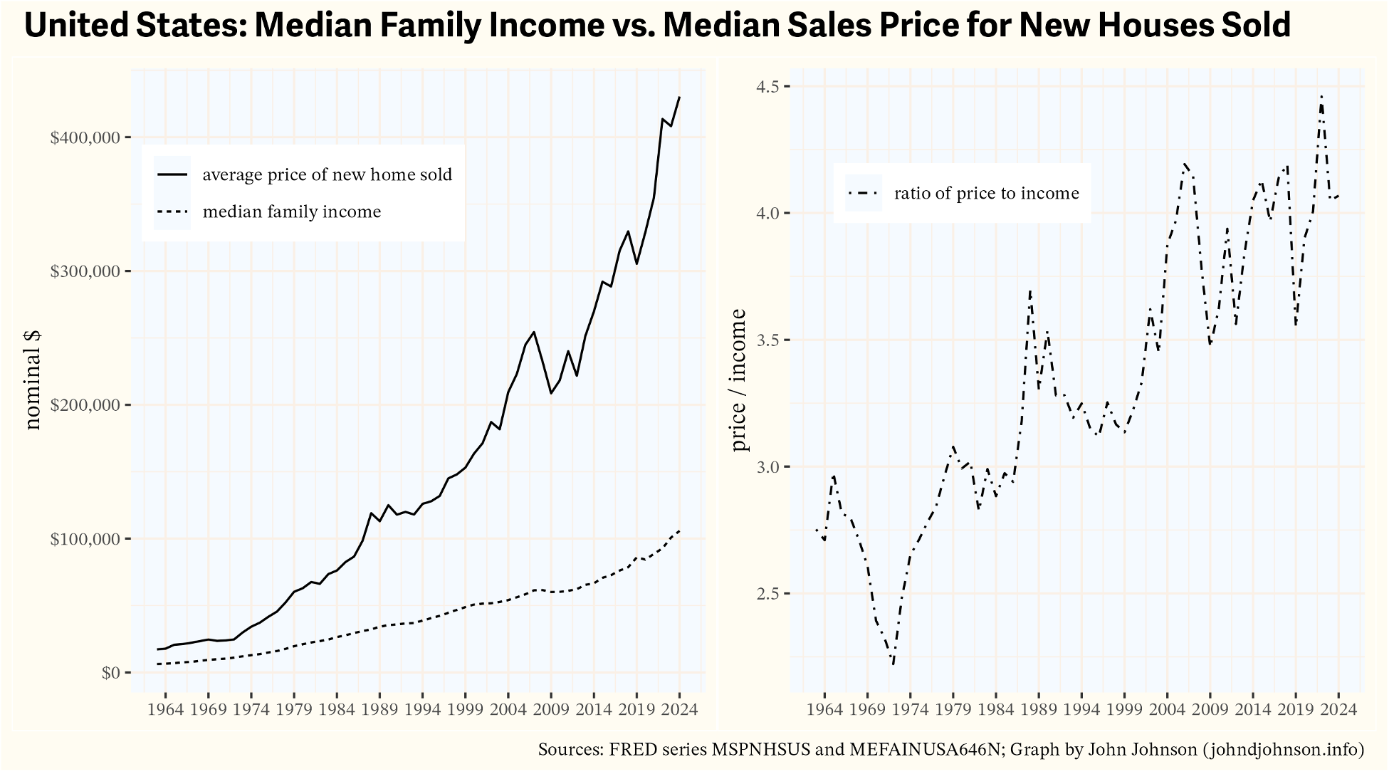 The census concept “households” includes people who live by themselves. New housing affordability looks a little less dire when we look at statistics for “families,” defined as at least two related people living together. Families increasingly consist of at least two wage earners, so the median family household income in 2024 was $105,800. Following the 3x rule, this family could afford a $317,400 house.