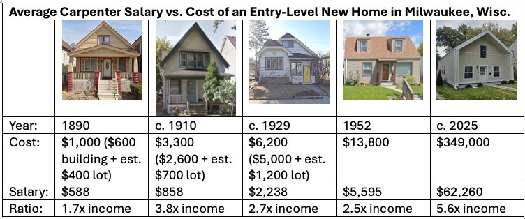 Today, wage data is easy to come by. In 2024, the median full time salary for a Milwaukee plumber was $82,080. It was $80,320 for bricklayers; $76,820 for electricians; $62,260 for carpenters; $55,420 for construction laborers; $53,010 for machinists; and $50,610 for painters. Housing costs are less clear, because very few new single family homes get built without government or philanthropic subsidies. In any given year, Habitat for Humanity is responsible for most of the detached, single-family homes built in the city.