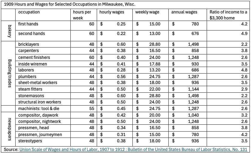 Newspaper ads from the time period show empty residential lots usually selling for $350 to $1,025. A common scenario might be building a $2,700 house on a $600 lot, for a total cost of $3,300.4 Here is how that cost compares with the wages paid to common Milwaukee professions in 1909. The wage numbers are from union wage scale data published by the Bureau of Labor Statistics.