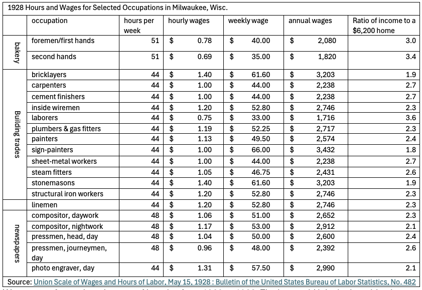 Newspaper ads from the period list many empty lots at prices ranging from $750 to $1,600. Taking a lot price of $1,200 would put the total cost of a basic duplex at $6,200. Here is how that cost compares to the 1928 wages of some common Milwaukee jobs.