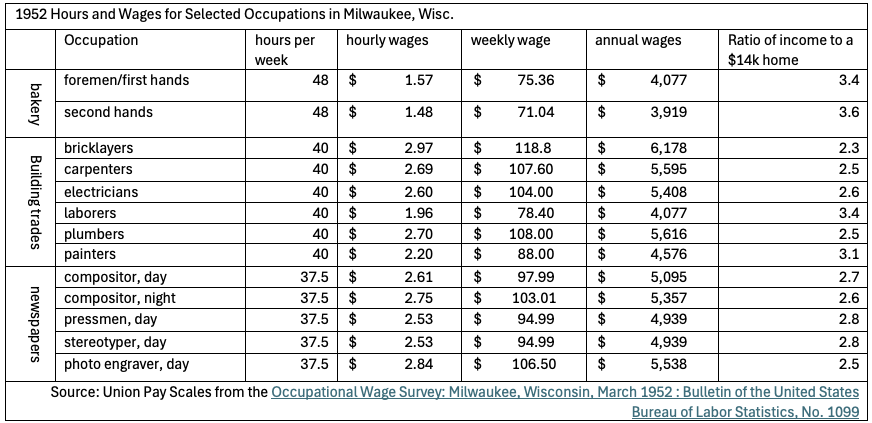 For $14,000, a buyer would be able to choose between a variety of houses across many neighborhoods. Here is how that cost compares to 1952 wages for common Milwaukee jobs.