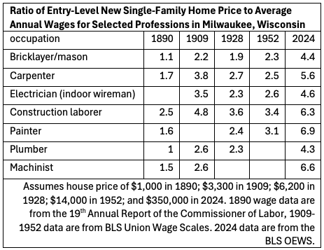 From everything I’ve seen, $350,000 seems like a reasonable (though possibly low) estimate of what it costs to build a modest single-family home today, excluding the cost of land, which is available practically for free in Milwaukee’s cheapest neighborhoods. This table shows a $350,000 housing cost as a ratio of median incomes for selected professions. It compares this 2024 ratio with ratios I’ve calculated for 1890, 1909, 1928, and 1952.