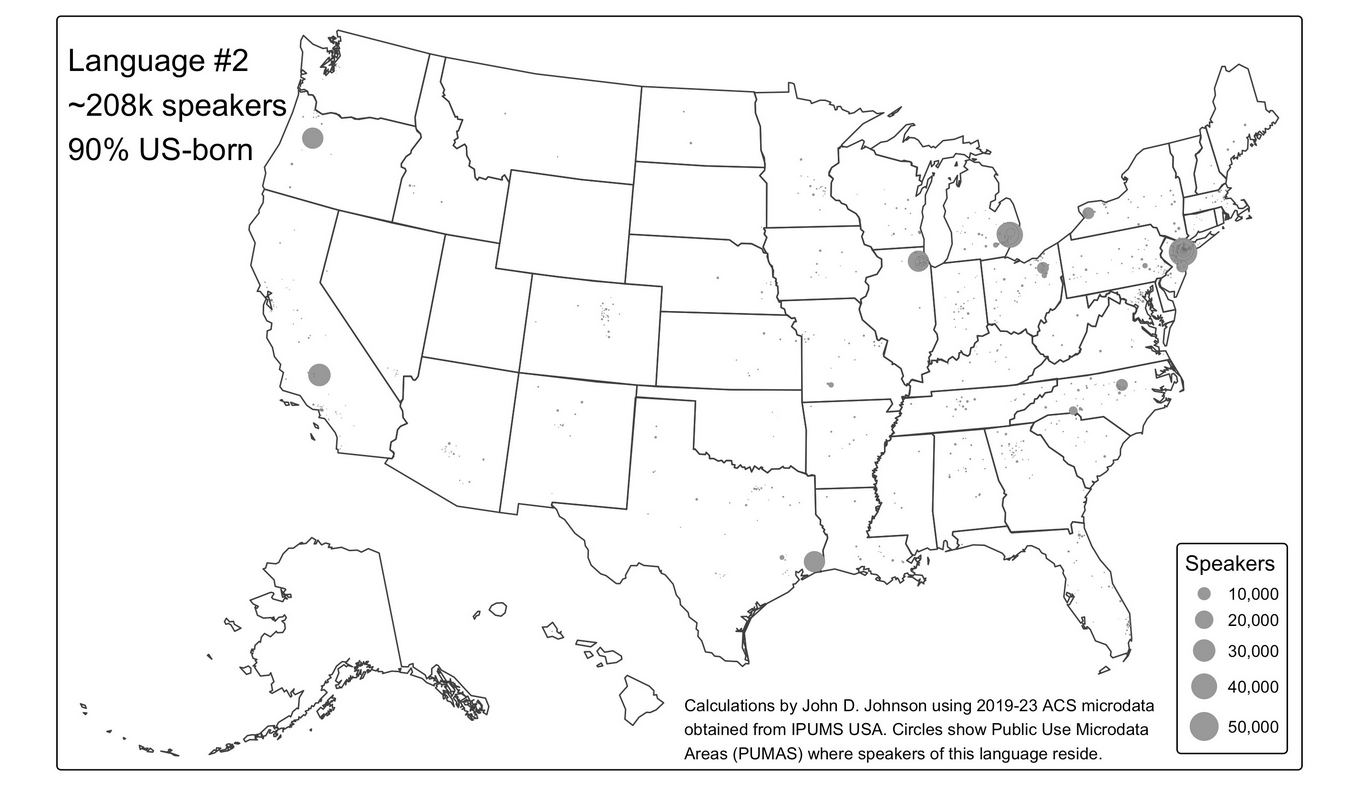 The 2000 census included language questions in the 5% national sample. The 2019-2023 American Community Survey was given to roughly 1% of the population each year.↩︎
