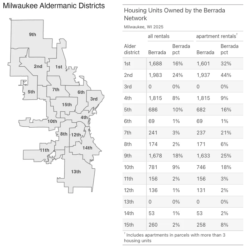 Citywide, Berrada-affiliated companies own 6.4% of all rental housing units. Milwaukee contains many rented single-family homes and duplexes, but Berrada specializes in apartment buildings. Among apartment buildings with at least 4 rental units, Berrada owns 10.9% of the housing stock.