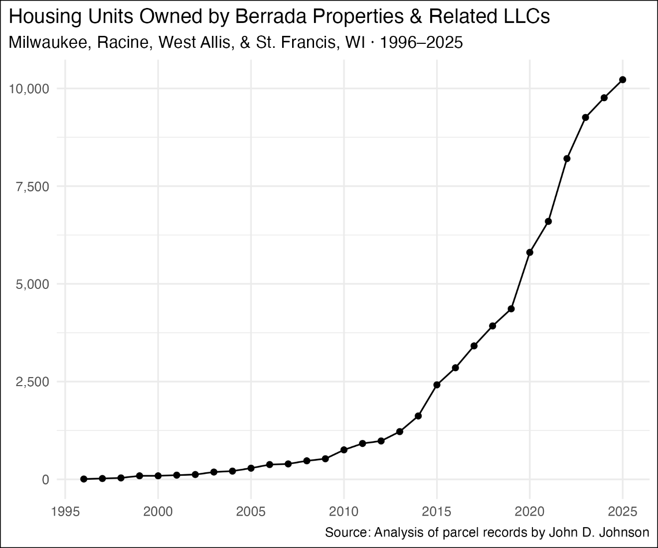 Berrada bought his first apartment building in Milwaukee in the spring of 1996 for $187,000. It’s an 8-unit building on Hampton and 79th. He owns it today (although he sold it in 2008 before buying it back in 2013). Since this initial purchase, the holdings of Berrada and LLCs affiliated with him have grown at an extraordinary clip. As of the end of 2025, I count over 880 apartment buildings holding a total of 10,223 housing units in the Berrada network.3